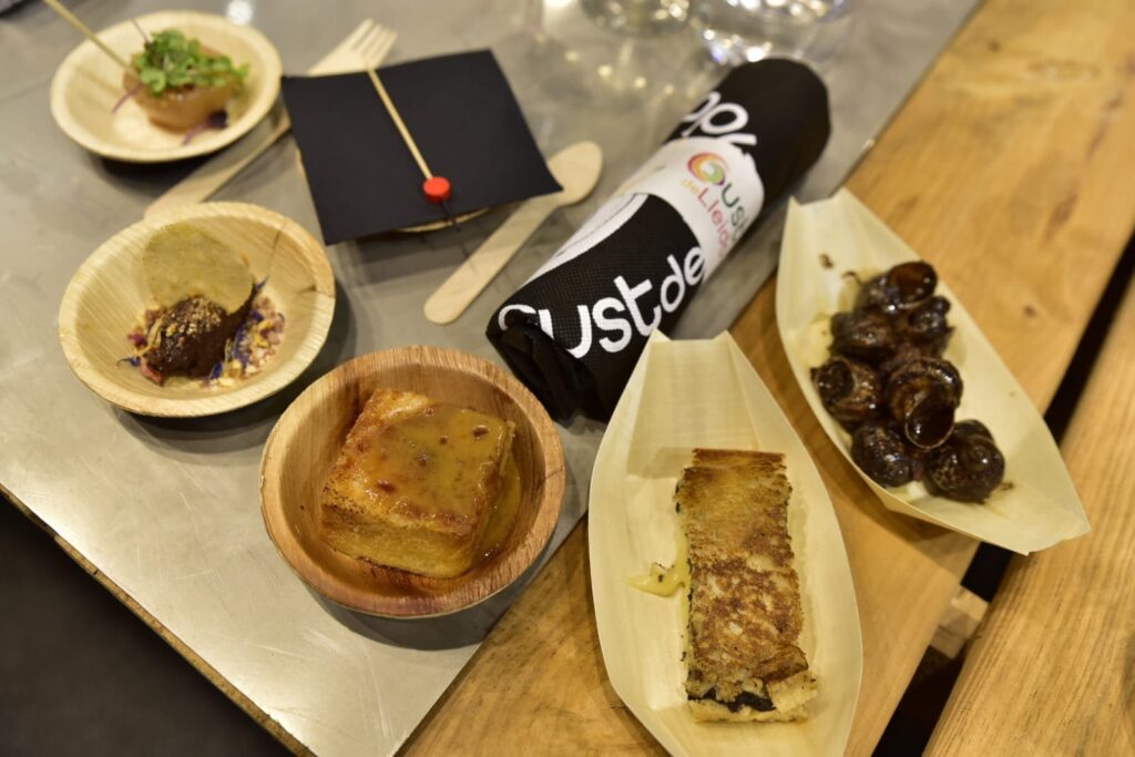Durante el primer día del Fórum, y dentro de la sesión dedicada a la marca Gust de Lleida, el chef Toni Alonso, de BO de Shalom, ha sido el encargado de preparar diversas tapas que reinterpretaban el territorio con creatividad y respeto por el producto local: higos de Alguaire con foie de Preixana, pera de Lleida confitada con vino del Batlliu de Sort y turrón de Agramunt con mermelada de manzana del Valle de Boí.